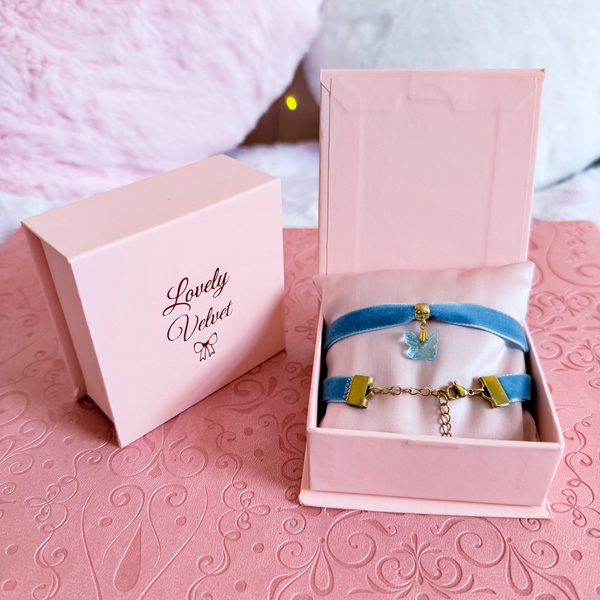 A dreamy splash of color for your jewelry collection, the Blue Butterfly Velvet Choker Necklace pairs delicate elegance with playful charm. Its glass butterfly charm shimmers with subtle glitter, catching the light with every movement and adding a touch of magic to your look.
