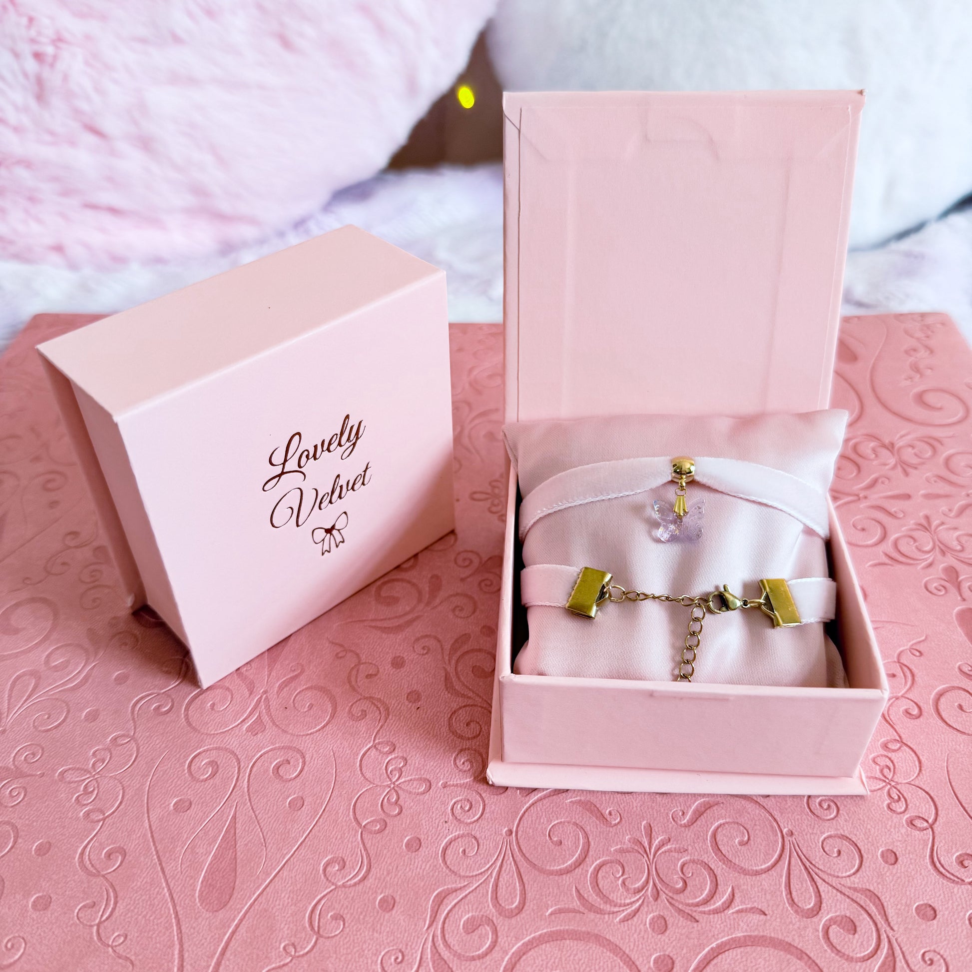 Add a whisper of enchantment to your look with the Lavender Mist Butterfly Velvet Choker Necklace - a delicate, luminous piece that brings a soft, romantic glow to your everyday style.